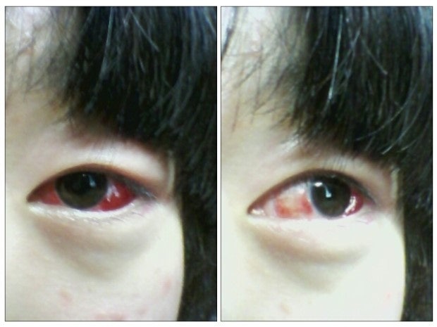 지금 현재 눈은 붓기가 가라앉으려고하지만 피가 내려온건지 눈알이 이상한데요 봐주시겟어요?